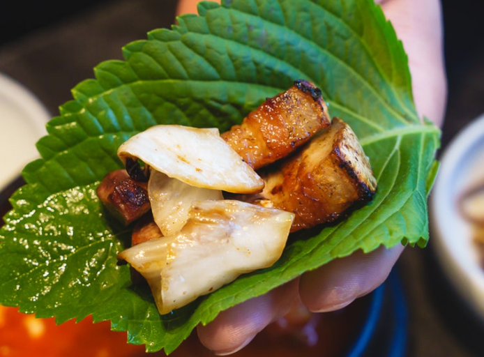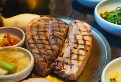 노릇노릇하게 초벌 되어 나온 고기는 보는 것만으로도 군침이 돕니다. 테이블에서 진행되는 그릴링 서비스는 흑돼지를 가장 완벽한 상태로 즐길 수 있게 도와줘요. 전문가의 손길로 구워진 고기는 겉은 바삭하고 속은 촉촉하며, 껍질 부분은 쫀득하고 살코기는 야들야들해 흔치 않은 식감을 자랑합니다. 짭조름하면서도 감칠맛 나는 명란젓 소스는 고기와 환상의 궁합을 자랑하며, 톡톡 터지는 식감으로 먹는 재미까지 더해줍니다.